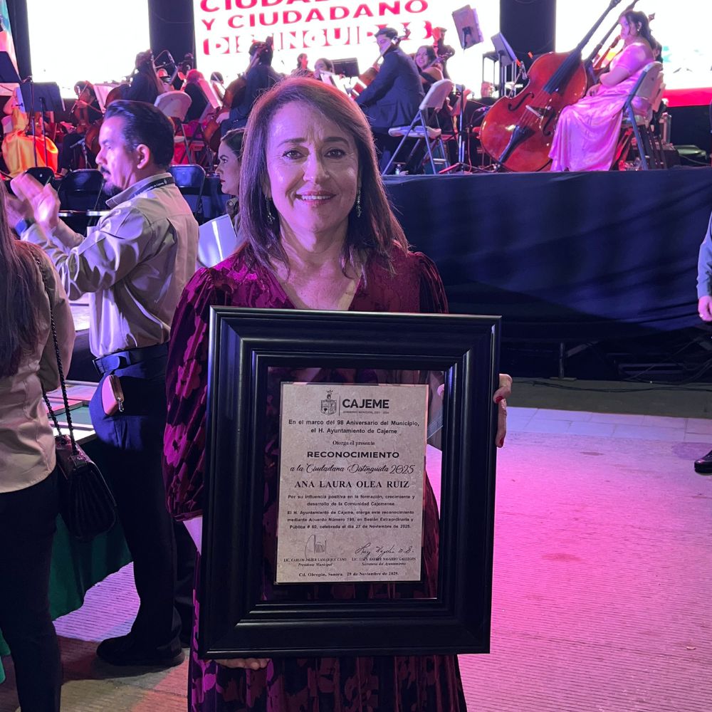 En esta edición de nuestro boletín queremos compartir una noticia que nos llena de orgullo y reafirma la fuerza de nuestro trabajo comunitario. Hoy celebramos un logro que inspira, impulsa y representa el espíritu de Jalo por Obregón: el reconocimiento otorgado a nuestra presidenta: Ana Laura Olea Ruiz, como Ciudadana Distinguida 2025 dentro del XXII Festival de Arte y Cultura Tetabiakte, en conmemoración del 98 aniversario de Cajeme. Este honor refleja no solo su liderazgo, sino el compromiso colectivo que hemos construido junto a toda la comunidad. Este reconocimiento celebra su trayectoria empresarial y su incansable labor al frente de Jalo por Obregón, donde ha impulsado proyectos de ecología, reciclaje y rescate de espacios públicos que hoy son ejemplo en nuestra ciudad. ¡Gracias, Ana Laura, por tu liderazgo, tu entrega y por recordarnos que cuando la ciudadanía se une, Cajeme avanza!